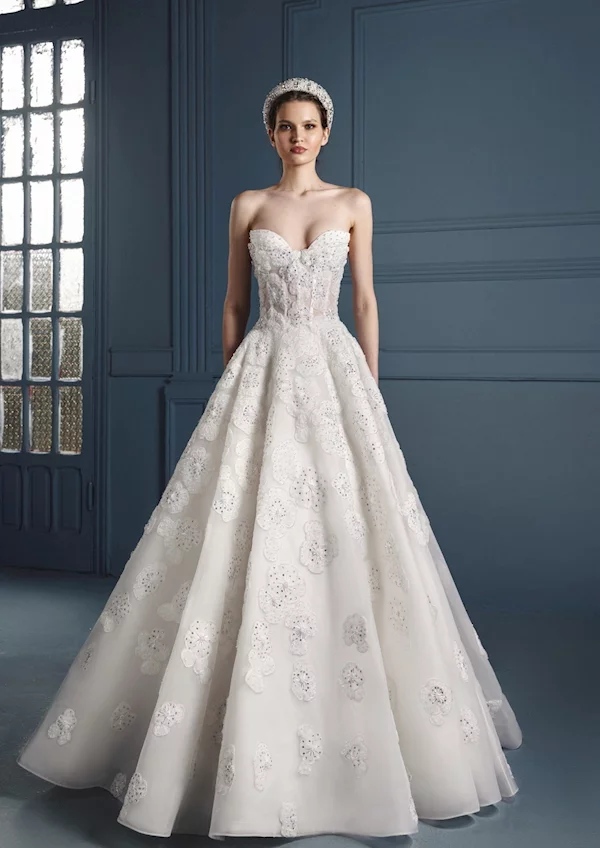 Gemy Maalouf’s 2026 gowns mix soft, flowing shapes with smart tailoring. Dresses often have light layers, small embroidery, and smooth fabrics that feel comfortable and look elegant. Many designs include statement sleeves, gentle patterns, and flowing skirts that look great in photos. Brides who want gowns that are both classy and easy to wear will love Gemy Maalouf’s collections.