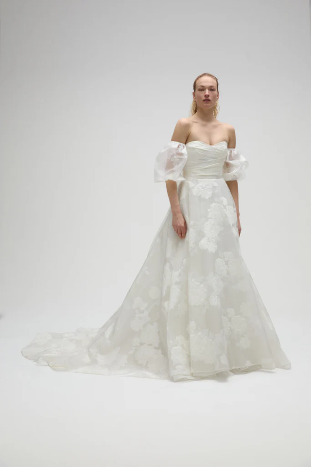 Key trends for this season include structured bodices combined with soft, flowing skirts, off-shoulder and illusion necklines, and strategic use of embellishments to create focal points. Textures like layered tulle, soft lace, and lightweight satin are being used to add dimension, while gowns with detachable trains and modular skirts offer versatility for ceremony and reception. Subtle embroidery and tone-on-tone beading were also seen across multiple collections, adding sophistication without overshadowing the gown’s overall design. Modern brides are seeking gowns that combine visual appeal with practicality, ensuring they look stunning from aisle to dance floor.
