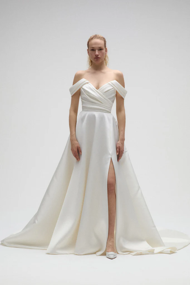 Amsale redefined simplicity for the season. Their gowns feature clean lines, sculpted shapes, and subtle textures, perfect for brides seeking modern sophistication. Off-shoulder and bateau necklines dominated, providing a timeless appeal, while lightweight crepe and satin fabrics ensured comfort. The collection’s muted palette emphasized the structure and fit of each gown, making it ideal for brides who prefer understated elegance with flawless craftsmanship. Small yet impactful details, such as hidden pockets and delicate back cutouts, gave each gown a modern twist. These gowns are ideal for brides who want to look effortlessly elegant while prioritizing comfort for long wedding celebrations.