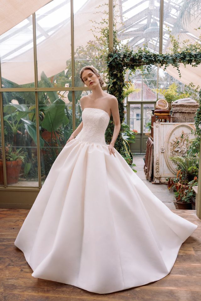 Drop waist gowns have a soft line that begins below the natural waist and blends into the skirt. This design allows the skirt to flow freely, creating movement and grace as the bride walks, twirls, or dances.