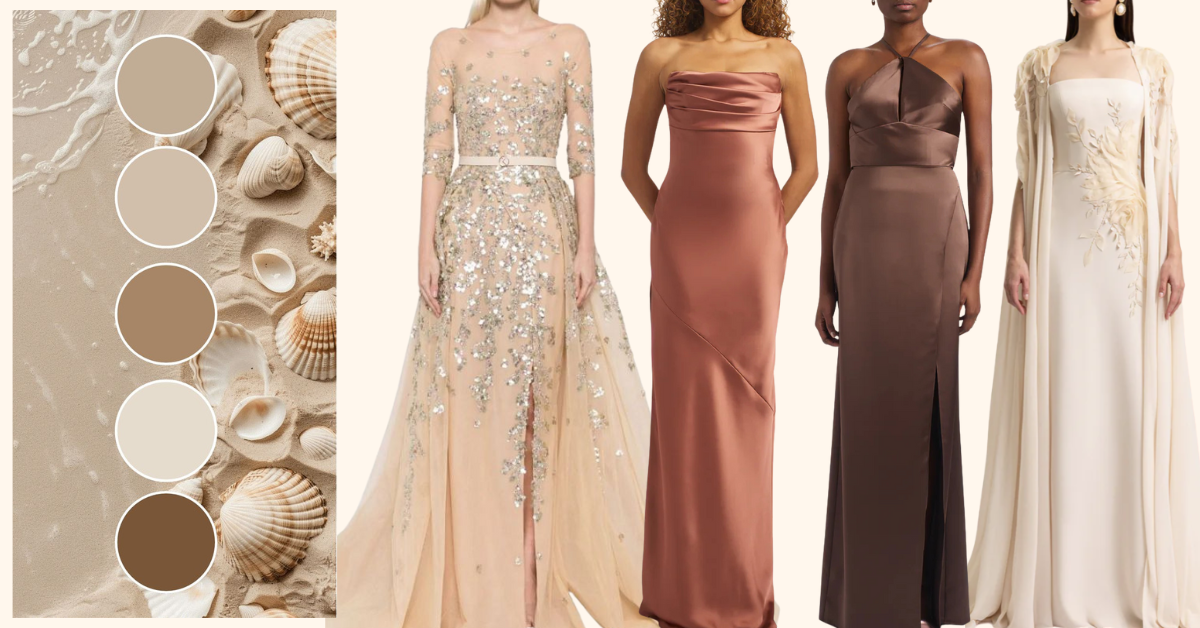 Earthy tones can also pair beautifully with seasonal flowers. Sage and olive green gowns enhance blush, peach, or cream florals, while neutral gowns allow colorful bouquets to stand out. Coordinating dresses with subtle fabric textures adds depth to the ensemble without making it look overly busy.